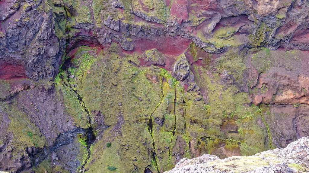 Rock wall, moss, and mini waterfalls in the volcanic landscape of Iceland.