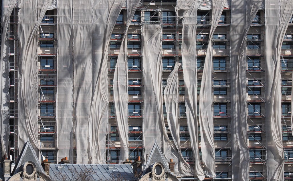 Dust covers forming waves in the wind on scaffolding in Paris, France.