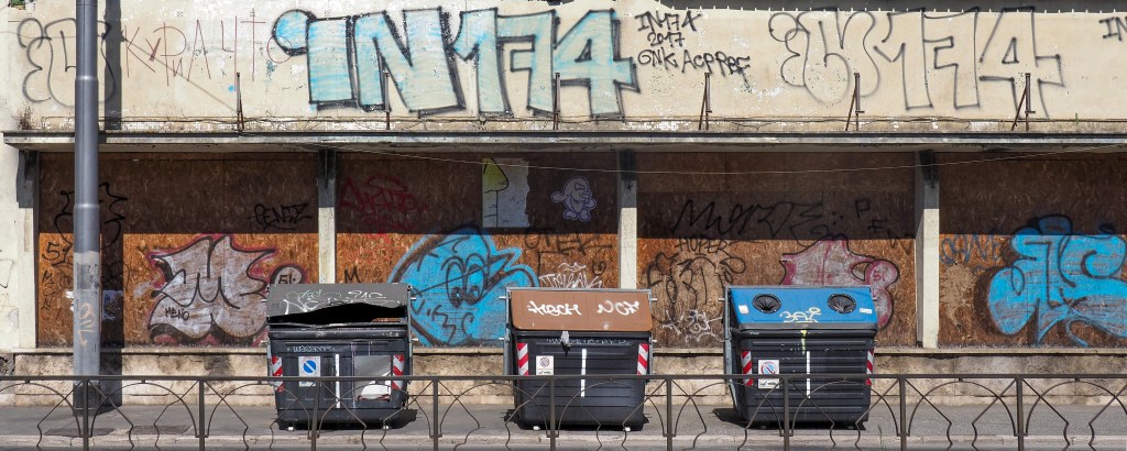 Blue on brown graffitis, in sync with the garbage containers. Rome, Italy.