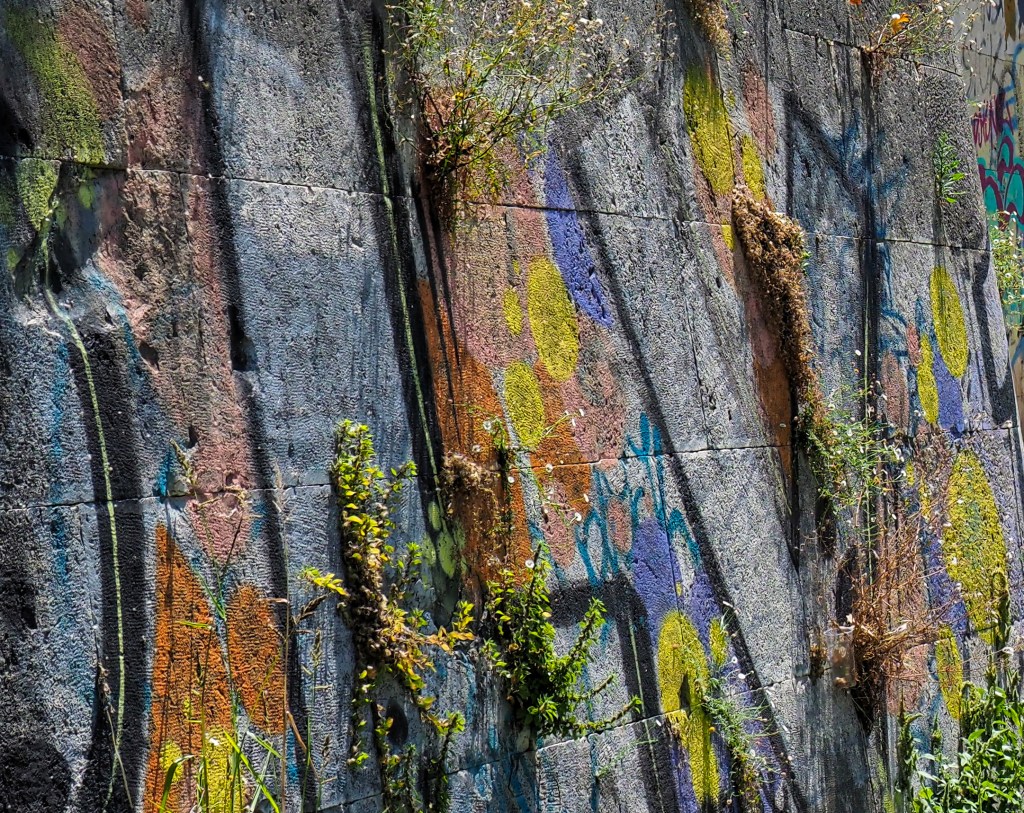 Graffiti and weeds covering the walls on the banks of the Tiber. Rome, Italy.