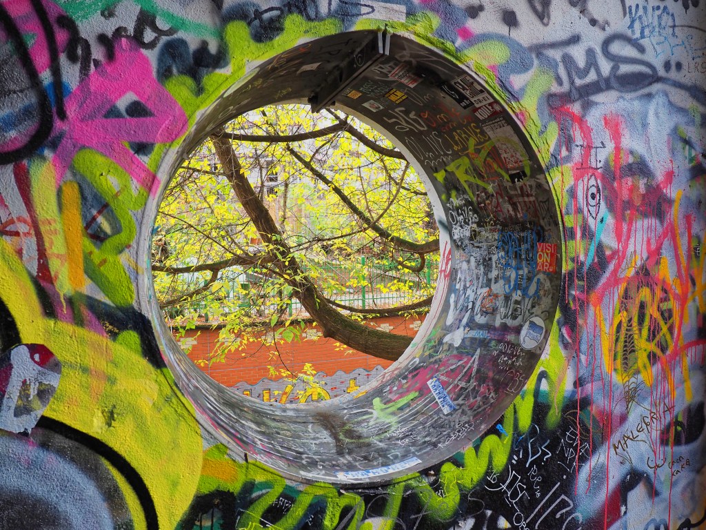 Graffiti on wall, tress behind the wall. Berlin, Germany.